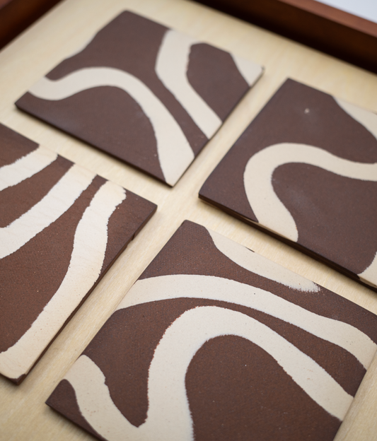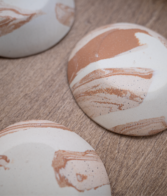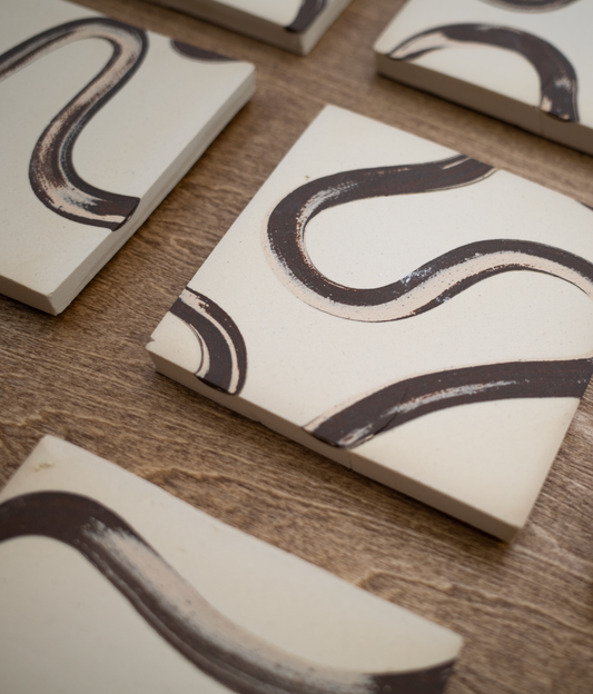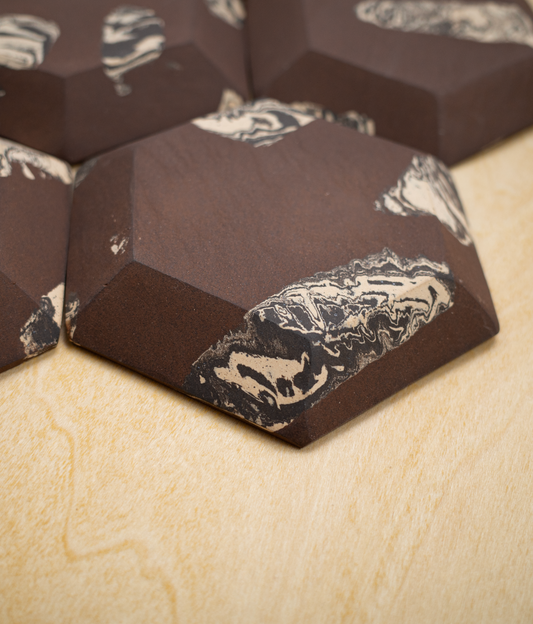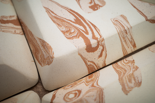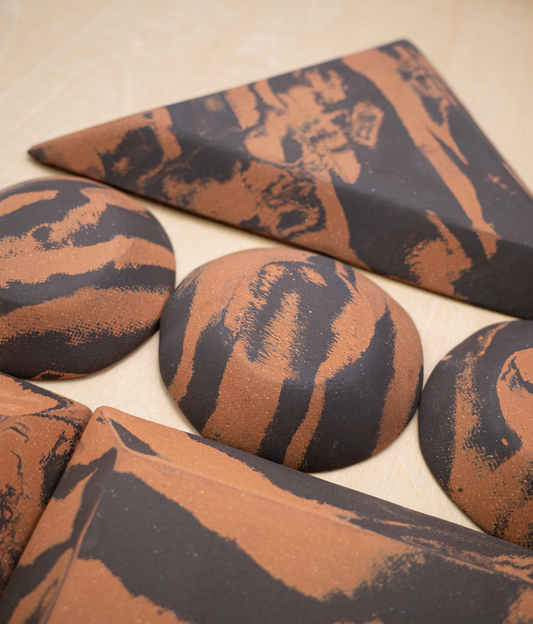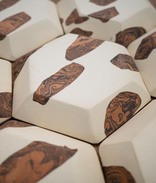 Terra Forms explores the juxtaposition of organic forms and geometric shapes through a series of wall-mounted ceramic sculptures. The show features Putnam's latest collection of marbled ceramic tiles, inspired by sandstone rock formations, trails, and topographic maps. - Ryan Putnam