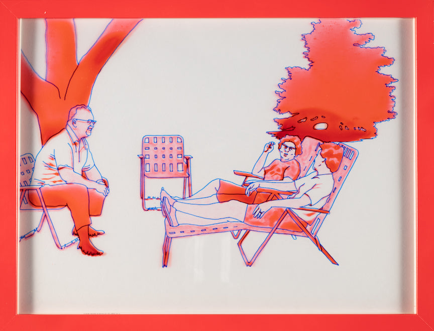 A work of art made with Ink on poly film of two reclining female figures on lawn chairs with seated male figure in red, white, and blue.