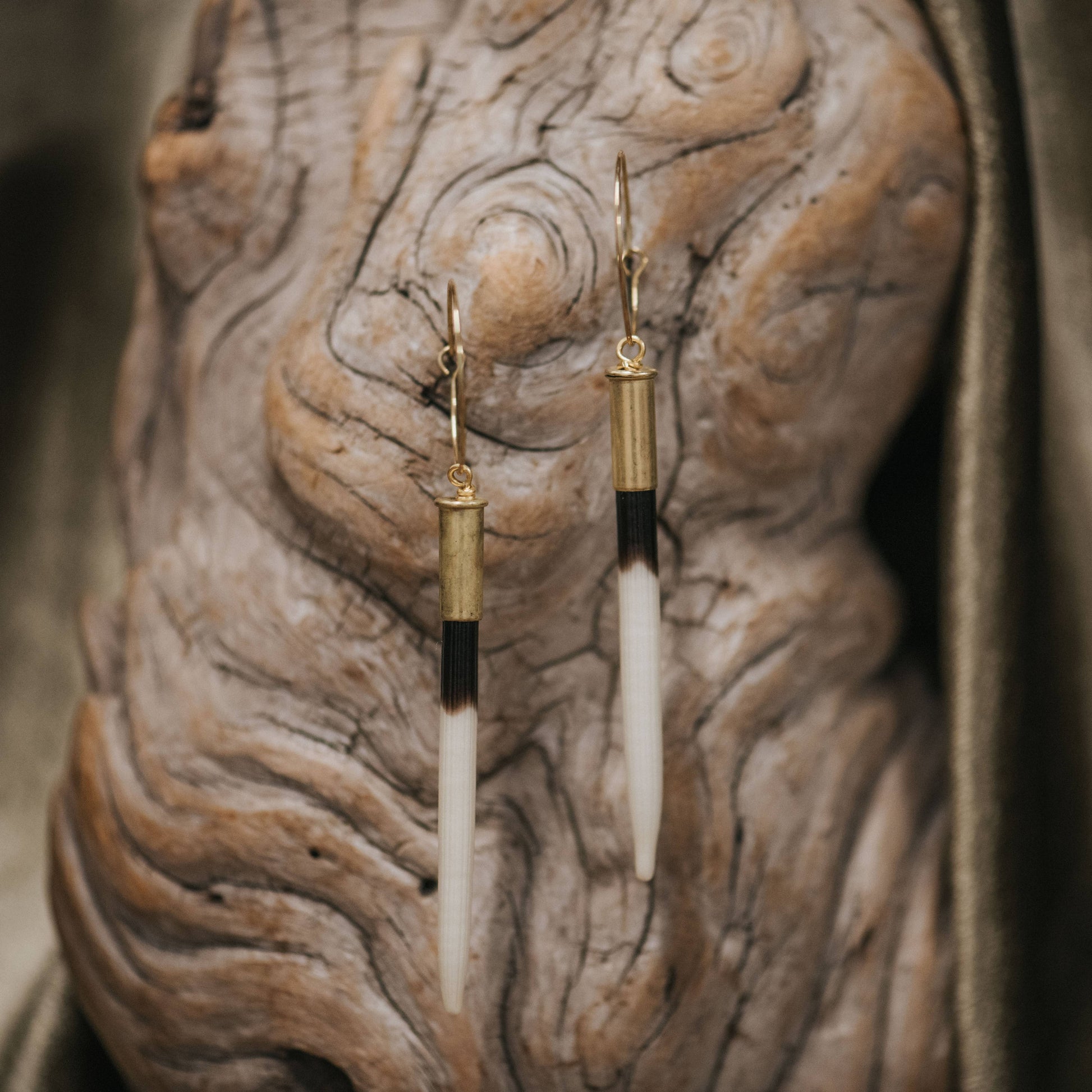 As seen in Yellowstone Season 5 Episode 3, worn by character Beth Dutton (Kelly Reilly), our natural porcupine quills are set in recycled .22 bullet casings hung from 1” brass hoops. If you’re looking for the same variation as Beth’s, please select “Short” and “Predominantly White” in the variants.