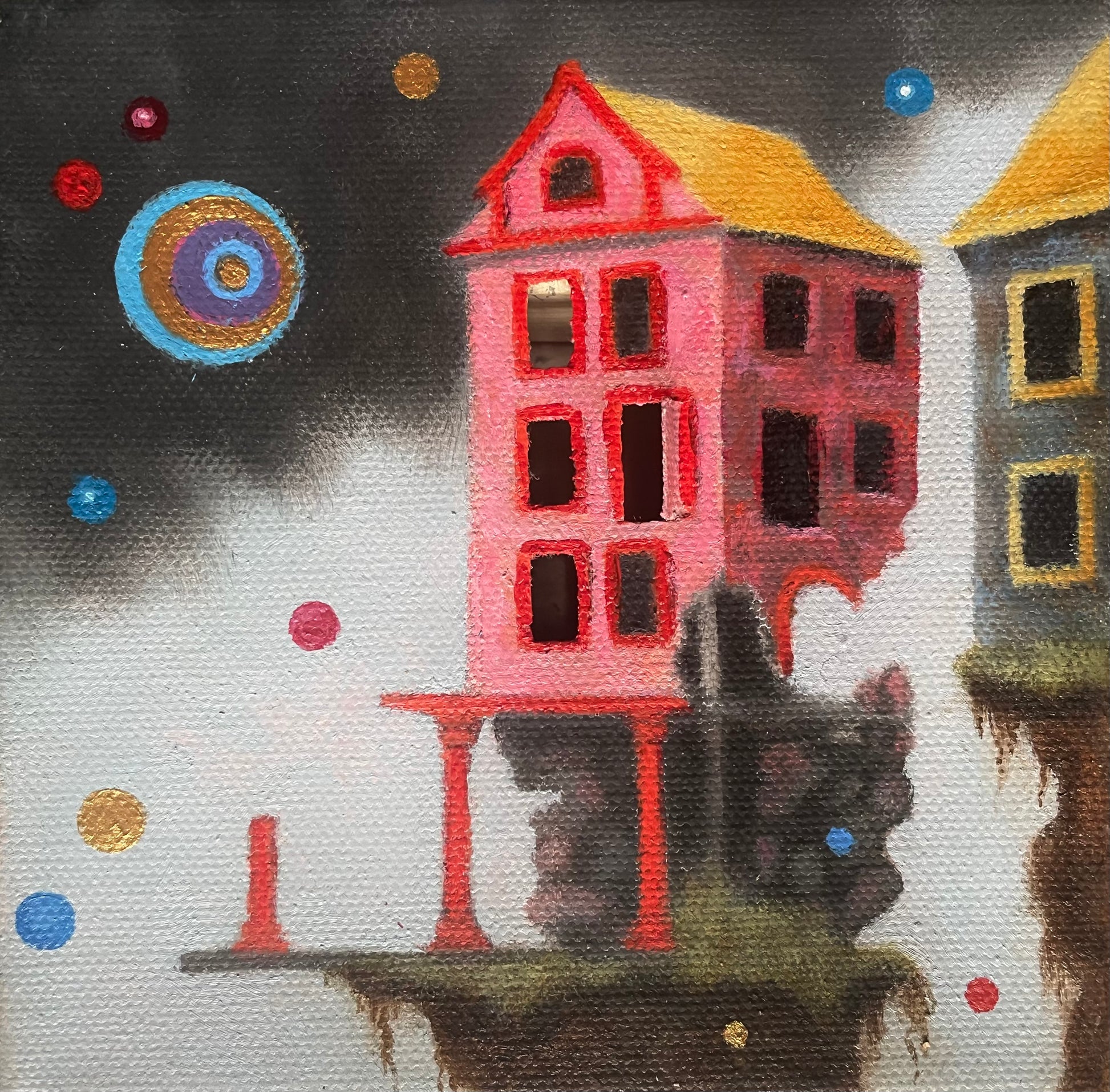 Oil, acrylic, and silver leaf and battery powered tea light(light glows through windows)