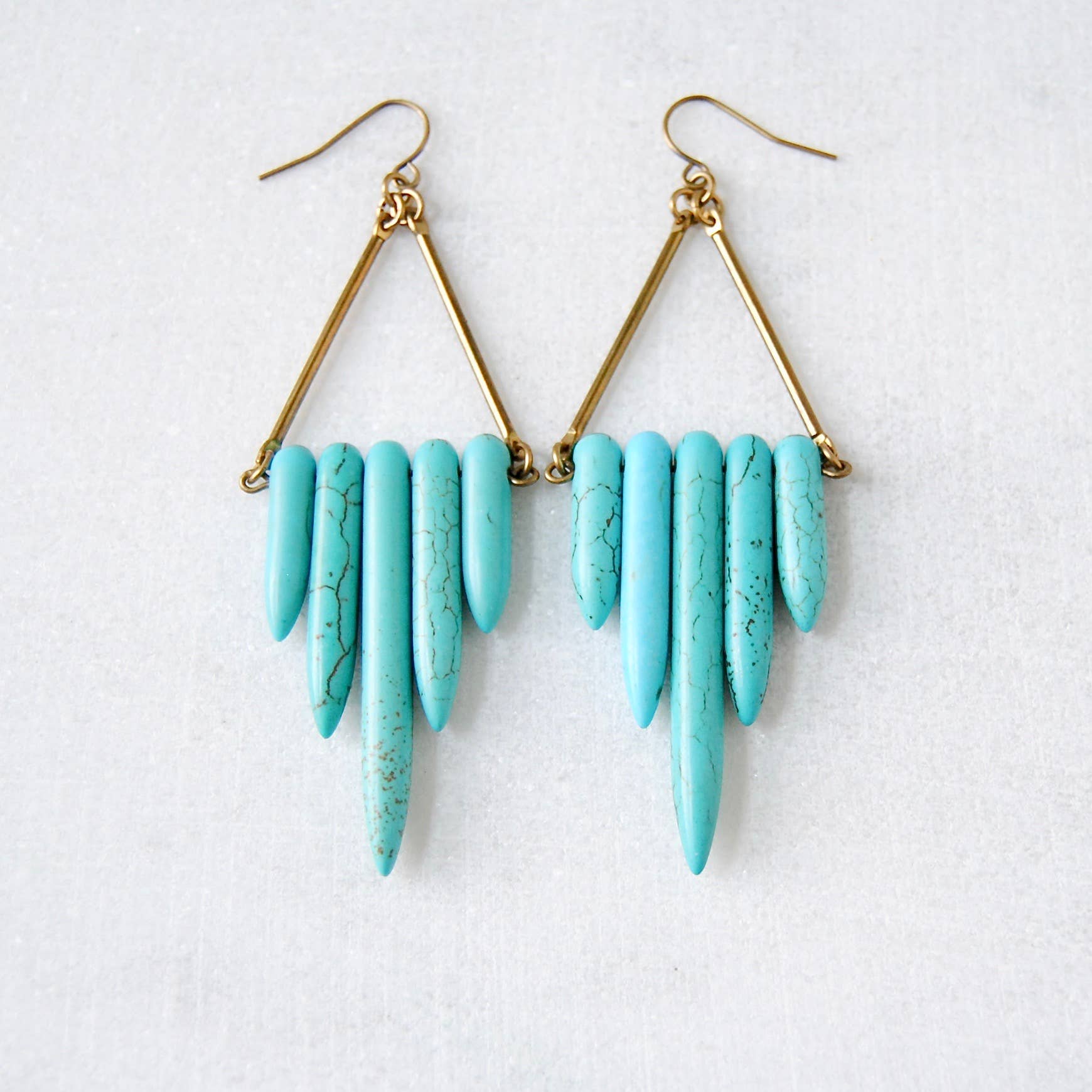 Make a statement with these boho beauties. Five gorgeous howlite stone beads in an angular shape hang confidently from vintage brass bars.