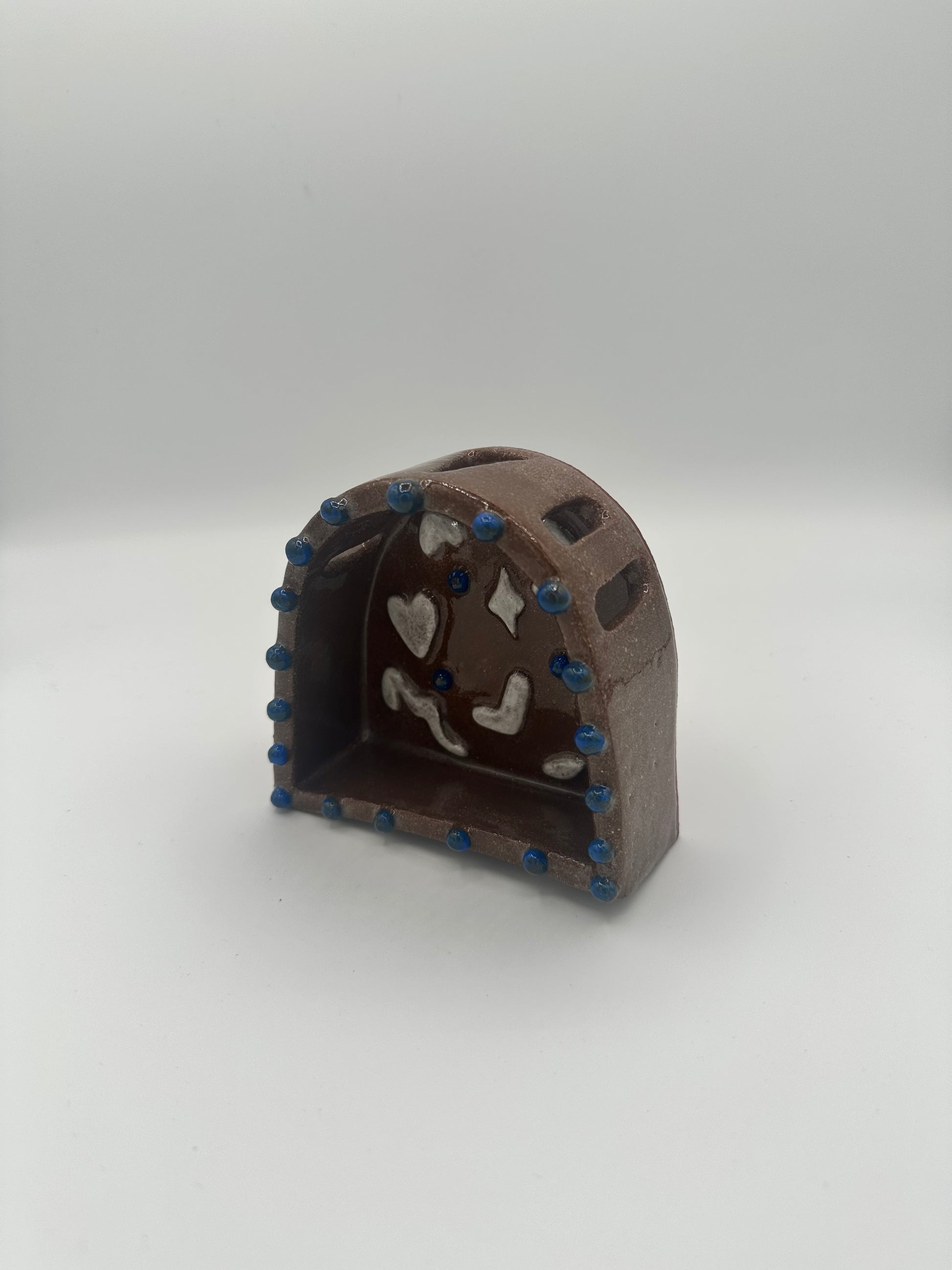Handmade ceramic mini altar with indigo decorative dots and ceramic icons